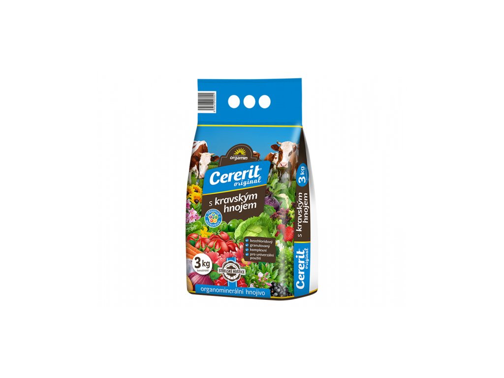 Cererit s kravským hnojem je bezchloridové směsné granulované organominerální NPK hnojivo s hořčíkem, sírou a stopovými prvky (B, Cu Mo, Zn). Přídavek organické složky v podobě granulovaného kravského hnoje dodává do půdy kromě základních a stopových živin i organické látky. Bezchloridové hnojivo vhodné i pro rostliny citlivé na chlór (např. ovocné stromy, réva vinná, rybíz, brambory, rajčata, tabák, leguminózy, okurky, cibule). Podíl organické složky v hnojivu zajišťuje dlouhodobější a pozvolnější uvolňování živin, naopak živiny v minerální formě jsou pro rostliny snadno přístupné, čímž je zajištěn jak okamžitý, tak i pozvolný přísun živin rostlinám. Složení: 6 % N + 8 % P2O5 + 8 % K2O + 1,5 % MgO + 8 % S.