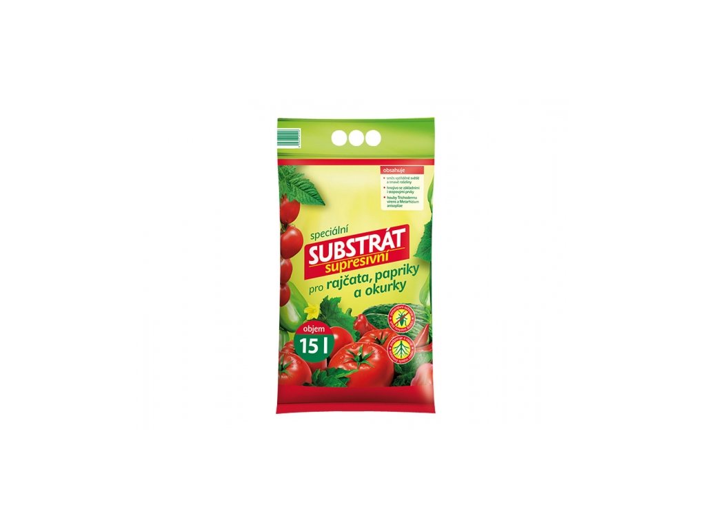 Supresivní substrát pro rajčata, papriky a okurky je určen pro pěstování uvedených plodin na záhonech, ve sklenících nebo v pěstebních nádobách. Je připraven ze směsi vytříděné světlé a tmavé rašeliny s upravenou pH reakcí. Substrát je obohacen hnojivem se základními i stopovými živinami v nezbytném rozsahu, což má příznivý vliv na růst a vývoj rostlin. Obsahuje také houbu Trichoderma virens, která aktivně potlačuje původce významných houbových onemocnění, zejména pak druhy rodu Fusarium, Pythium Sclerotinia a Rhizoctonia, které způsobují odumírání rostlin. Používání tohoto substrátu představuje významný preventivní prvek v ochraně rostlin před uvedenými druhy škodlivých organizmů. Navíc, přítomnost zmíněné houby (Trichoderma virens) pozitivně ovlivňuje zakořeňování a vývoj rostlin a rostliny na přítomnost tohoto organizmu reagují i navozením stavu tzv. indukované rezistence, tj. stavu zvýšené odolnosti proti širokému spektru škodlivých organizmů. Dále je supresivní substrát obohacen o houbu Metarhizium anisopliae, která představuje účinnou prevenci před poškozením hmyzími škůdci napadajícími rostliny. Hlavním cílem záměrné inokulace substrátu tímto užitečným organizmem je ochrana sazenic i vzešlých rostlin různých druhů zelenin před škůdci napadajícími kořenový systém rostlin, např. před larvami kovaříků (tzv. drátovců), lalokonosců, chroustů a chroustků, krtonožek, osenic a řady dalších škůdců. Kromě druhů škůdců, kteří se vyskytují výhradně v půdě je významný i účinek houby na hmyzí škůdce, kteří v půdě prodělávají pouze část svého vývoje (např. třásněnky).